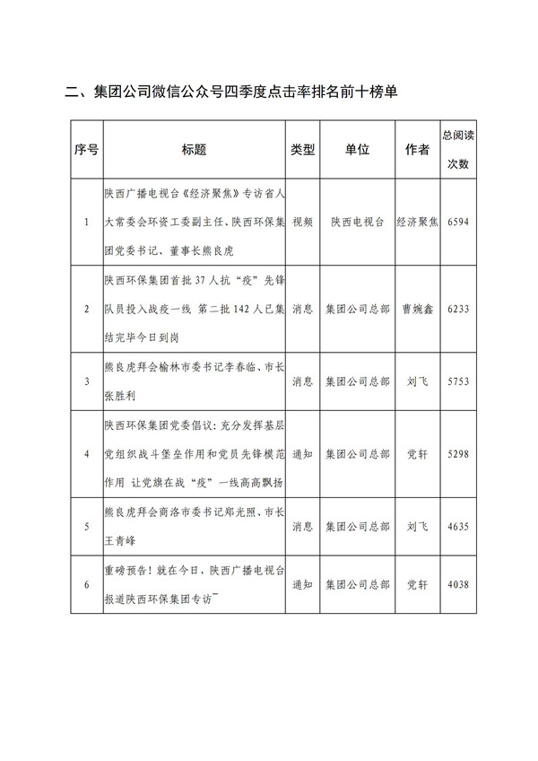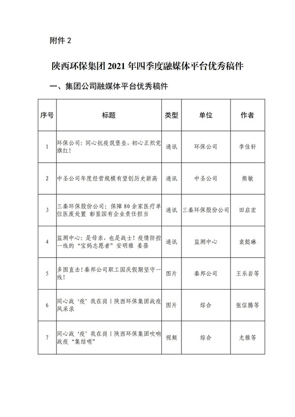 為加強(qiáng)集團(tuán)公司門戶網(wǎng)站、微信公眾號、新浪微博、視頻號等融媒體平臺的稿件采編工作,鼓勵(lì)廣大通訊員圍繞企業(yè)中心工作撰寫出高質(zhì)量的稿件,發(fā)揮優(yōu)秀稿件的示范作用,為集團(tuán)高質(zhì)量發(fā)展鼓與呼,按照集團(tuán)公司《關(guān)于建立政務(wù)信息采用情況通報(bào)和優(yōu)秀稿件評選制度的通知》(陜環(huán)司函〔2021〕31號)文件要求,現(xiàn)將2021年度集團(tuán)公司融媒體平臺稿件采用及2021年四季度優(yōu)秀稿件評選情況通報(bào)如下: