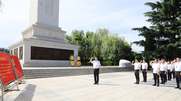 蒼松肅立,翠柏靜哀,以中共陜西環(huán)保產(chǎn)業(yè)集團(tuán)有限責(zé)任公司委員會(huì)、陜西環(huán)保產(chǎn)業(yè)集團(tuán)有限責(zé)任公司名義敬獻(xiàn)的兩個(gè)花籃一字排開(kāi),寄托著對(duì)革命先烈的深切緬懷和崇高敬意。集團(tuán)公司黨委書(shū)記郝軍亮緩步上前,仔細(xì)整理花籃緞帶?,F(xiàn)場(chǎng)黨員面向紀(jì)念碑鞠躬致敬,集體繞行瞻仰渭華起義烈士紀(jì)念碑。隨后,大家走進(jìn)渭華起義陳列大廳,跟隨講解員的講解,從渭華起義爆發(fā)的歷史背景、選址原因、準(zhǔn)備工作、主要經(jīng)過(guò)等方面追憶崢嶸歲月。在一張張照片、一份份資料、一件件實(shí)物前,大家不時(shí)駐足觀看、交流討論,強(qiáng)烈感受革命先烈們?yōu)榱嗣褡濯?dú)立、人民解放拋頭顱、灑熱血的英雄氣概。