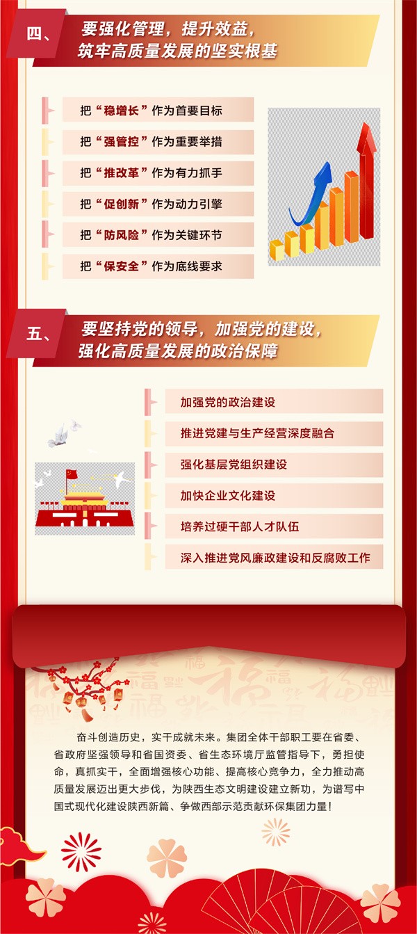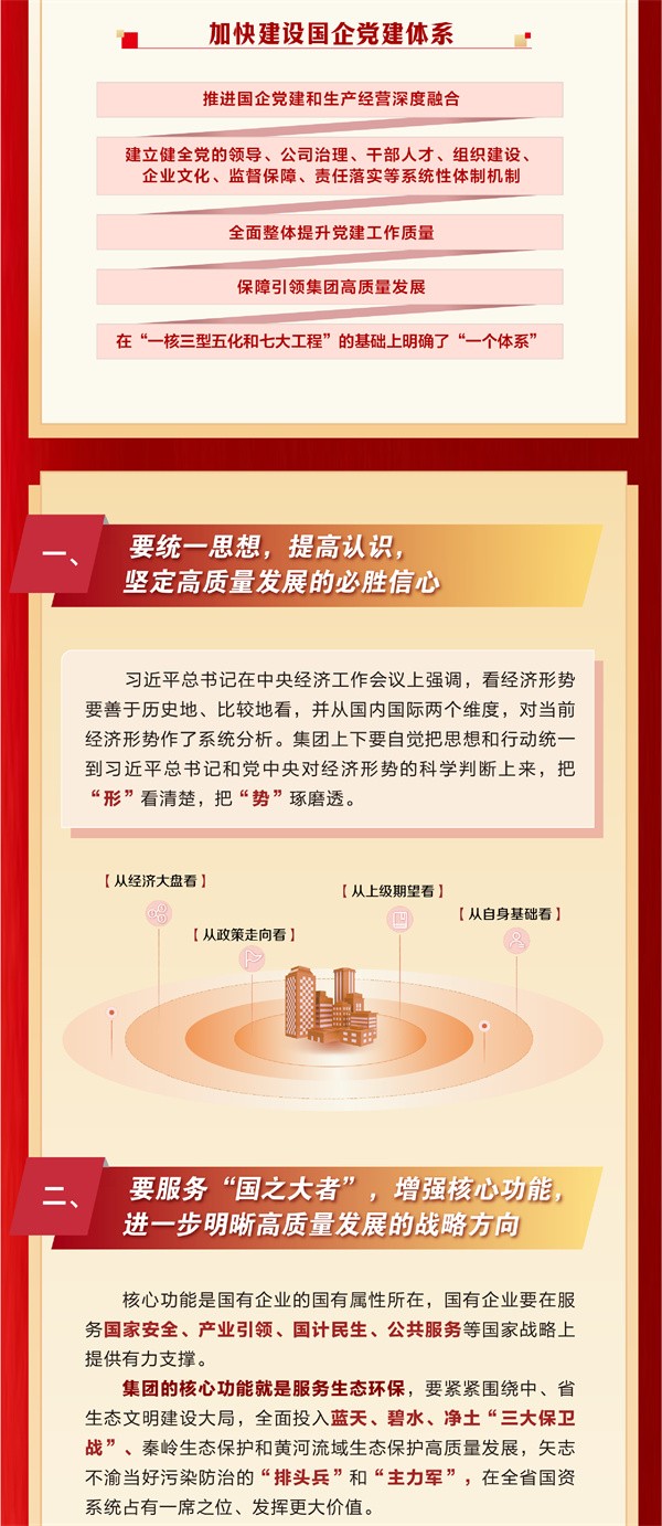 就進(jìn)一步做好集團(tuán)2024年工作,郝軍亮提出五個(gè)方面意見(jiàn):一是統(tǒng)一思想,提高認(rèn)識(shí),堅(jiān)定高質(zhì)量發(fā)展的必勝信心。要正視困難、直面問(wèn)題,堅(jiān)定信心、保持定力,大幅化解存量問(wèn)題,有效遏制增量問(wèn)題,全面提高合規(guī)管理水平,促進(jìn)穩(wěn)健經(jīng)營(yíng),推動(dòng)高質(zhì)量發(fā)展。二是服務(wù)“國(guó)之大者”,增強(qiáng)核心功能,進(jìn)一步明晰高質(zhì)量發(fā)展的戰(zhàn)略方向。要聚焦“服務(wù)生態(tài)環(huán)?!边@一核心功能,緊緊圍繞中、省生態(tài)文明建設(shè)大局,全面投入藍(lán)天、碧水、凈土“三大保衛(wèi)戰(zhàn)”、秦嶺生態(tài)保護(hù)、黃河流域生態(tài)保護(hù)和高質(zhì)量發(fā)展,矢志不渝當(dāng)好污染防治的“排頭兵”和“主力軍”,在全省國(guó)資系統(tǒng)占有一席之位、發(fā)揮更大價(jià)值。三是補(bǔ)短板、強(qiáng)弱項(xiàng),提高核心競(jìng)爭(zhēng)力,厚植高質(zhì)量發(fā)展的核心優(yōu)勢(shì)。要突出“科技、效率、人才、品牌、模式”五個(gè)關(guān)鍵,加快補(bǔ)齊短板、強(qiáng)化弱項(xiàng)、鍛造綜合優(yōu)勢(shì),努力提升核心競(jìng)爭(zhēng)力。四是強(qiáng)化管理,提升效益,筑牢高質(zhì)量發(fā)展的堅(jiān)實(shí)根基。要把“穩(wěn)增長(zhǎng)”作為首要目標(biāo),把“強(qiáng)管控”作為重要舉措,把“推改革”作為有力抓手,把“促創(chuàng)新”作為動(dòng)力引擎,把“防風(fēng)險(xiǎn)”作為關(guān)鍵環(huán)節(jié),把“保安全”作為底線要求。五是堅(jiān)持黨的領(lǐng)導(dǎo),加強(qiáng)黨的建設(shè),強(qiáng)化高質(zhì)量發(fā)展的政治保障。要通過(guò)加強(qiáng)黨的政治建設(shè),推進(jìn)黨建與生產(chǎn)經(jīng)營(yíng)深度融合,強(qiáng)化基層黨組織建設(shè),加快企業(yè)文化建設(shè),培養(yǎng)過(guò)硬干部人才隊(duì)伍,深入推進(jìn)黨風(fēng)廉政建設(shè)和反腐敗工作等舉措,服務(wù)保障黨中央重大決策部署和省委、省政府工作要求在集團(tuán)落實(shí)落地,以實(shí)干實(shí)績(jī)擁護(hù)“兩個(gè)確立”、做到“兩個(gè)維護(hù)”。