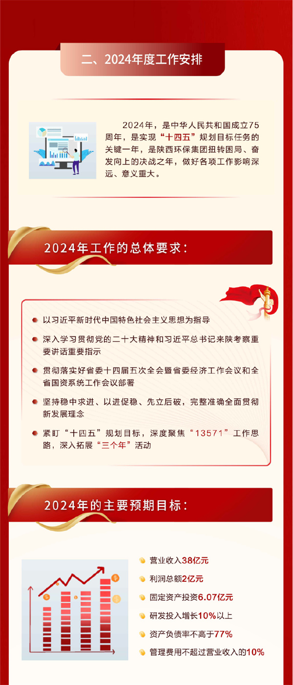 報(bào)告從“頂層設(shè)計(jì)、市場(chǎng)拓展、項(xiàng)目建設(shè)、國(guó)企改革、科技創(chuàng)新、內(nèi)部管控”六個(gè)方面全面總結(jié)2023年工作成效,客觀分析了當(dāng)前存在的問(wèn)題,并提出2024年工作重點(diǎn):堅(jiān)持穩(wěn)中求進(jìn)、以進(jìn)促穩(wěn)、先立后破的工作導(dǎo)向,深度聚焦“13571”發(fā)展思路,推動(dòng)集團(tuán)增強(qiáng)核心功能、提高核心競(jìng)爭(zhēng)力,加快建成國(guó)內(nèi)一流環(huán)保企業(yè),為改善區(qū)域生態(tài)環(huán)境、助推環(huán)保產(chǎn)業(yè)發(fā)展、譜寫(xiě)中國(guó)式現(xiàn)代化建設(shè)的陜西新篇章作出更大貢獻(xiàn)。2024年主要經(jīng)營(yíng)目標(biāo)是:全年實(shí)現(xiàn)營(yíng)業(yè)收入38億元,利潤(rùn)總額2億元,固定資產(chǎn)投資6.07億元,研發(fā)投入增長(zhǎng)10%以上,資產(chǎn)負(fù)債率不高于77%,管理費(fèi)用不超過(guò)營(yíng)業(yè)收入的10%。