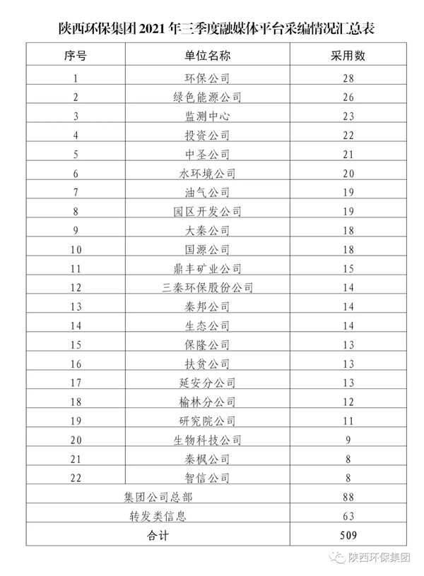 三季度,集團(tuán)公司融媒體平臺共計(jì)刊發(fā)稿件509篇。其中,環(huán)保公司、綠色能源公司、監(jiān)測中心、投資公司等企業(yè)報(bào)送稿件數(shù)量較多、質(zhì)量較高,較好地發(fā)揮了表率帶頭作用。希望各單位進(jìn)一步加強(qiáng)稿件報(bào)送工作,提升稿件報(bào)送質(zhì)量,以先進(jìn)為榜樣、對標(biāo)奪標(biāo),見賢思齊、比學(xué)趕超,充分展示本單位發(fā)展的新面貌、新形象、新成就。