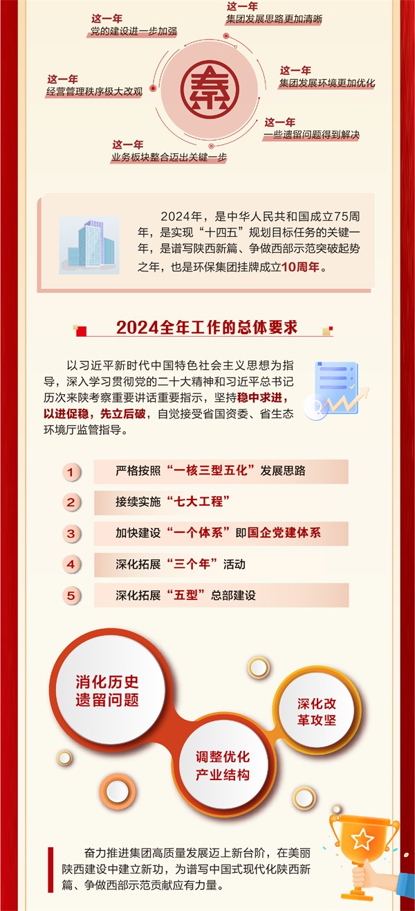 郝軍亮強(qiáng)調(diào),2024年是中華人民共和國(guó)成立75周年,是實(shí)現(xiàn)“十四五”規(guī)劃目標(biāo)任務(wù)的關(guān)鍵一年,是譜寫(xiě)陜西新篇、爭(zhēng)做西部示范突破起勢(shì)之年,也是環(huán)保集團(tuán)掛牌成立10周年。全年工作的總體要求是:以習(xí)近平新時(shí)代中國(guó)特色社會(huì)主義思想為指導(dǎo),深入學(xué)習(xí)貫徹黨的二十大精神和習(xí)近平總書(shū)記來(lái)陜考察重要講話重要指示,堅(jiān)持穩(wěn)中求進(jìn),以進(jìn)促穩(wěn),先立后破,自覺(jué)接受省國(guó)資委、省生態(tài)環(huán)境廳監(jiān)管指導(dǎo),持續(xù)堅(jiān)持“一核三型五化”,接續(xù)實(shí)施“七大工程”,加快建設(shè)國(guó)企黨建“一個(gè)體系”的“13571”發(fā)展思路,深化拓展“三個(gè)年”活動(dòng)和“五型”總部建設(shè),下大力氣消化歷史遺留問(wèn)題、調(diào)整優(yōu)化產(chǎn)業(yè)結(jié)構(gòu)、深化改革攻堅(jiān),奮力推進(jìn)集團(tuán)高質(zhì)量發(fā)展邁上新臺(tái)階,在陜西生態(tài)文明建設(shè)中再立新功,為譜寫(xiě)中國(guó)式現(xiàn)代化陜西新篇、爭(zhēng)做西部示范貢獻(xiàn)應(yīng)有力量。