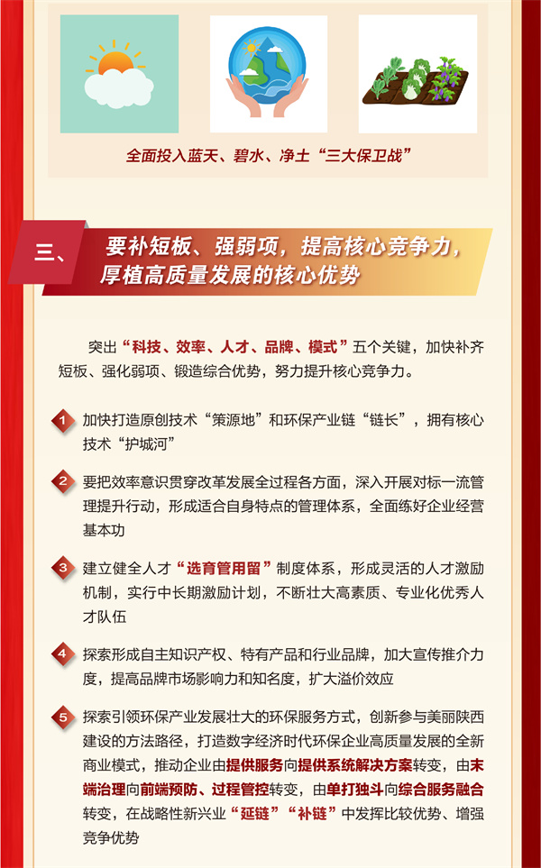 周建新要求,一要聚焦美麗中國(guó)先行區(qū)建設(shè)興產(chǎn)業(yè)樹(shù)樣板。圍繞秦嶺、黃河、南水北調(diào)中線工程水源地“三大生態(tài)屏障”,在打造美麗中國(guó)先行區(qū)陜西樣板上求突破,樹(shù)立可示范可推廣的典型,努力把美麗陜西建設(shè)推到一個(gè)更高的水平。二要聚焦突出生態(tài)環(huán)境問(wèn)題抓治理求突破。強(qiáng)化創(chuàng)新意識(shí),始終站在環(huán)??萍嫉那把仃嚨?,聚焦關(guān)中大氣治理、危險(xiǎn)廢物處置、地下水保護(hù)等突出生態(tài)環(huán)境問(wèn)題,深化國(guó)企改革,整合優(yōu)勢(shì)資源,優(yōu)化產(chǎn)業(yè)布局,不斷提升企業(yè)創(chuàng)新力、核心競(jìng)爭(zhēng)力、品牌影響力。三要聚焦重點(diǎn)治理項(xiàng)目建設(shè)嚴(yán)管理提質(zhì)效。堅(jiān)持問(wèn)題導(dǎo)向、目標(biāo)導(dǎo)向、結(jié)果導(dǎo)向,聚焦全省區(qū)域流域突出生態(tài)環(huán)境問(wèn)題和生態(tài)環(huán)境保護(hù)重點(diǎn)任務(wù),以實(shí)現(xiàn)經(jīng)濟(jì)效益和生態(tài)效益“共贏”為切入點(diǎn),嚴(yán)格管理項(xiàng)目,提升治理效果,打造樣板工程,以優(yōu)質(zhì)項(xiàng)目支撐全省高質(zhì)量發(fā)展和高水平保護(hù)。