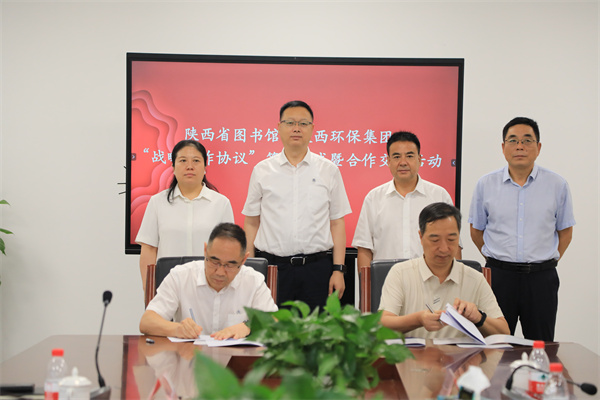 8月14日,陜西環(huán)保集團(tuán)與陜西省圖書館在省圖書館高新館區(qū)簽訂戰(zhàn)略合作協(xié)議。陜西環(huán)保集團(tuán)黨委書記、董事長郝軍亮,陜西省圖書館黨委書記、館長周云岳出席簽約儀式。陜西環(huán)保集團(tuán)黨委副書記、董事、工會(huì)主席趙建文,陜西省圖書館黨委委員、工會(huì)主席胡竹林分別代表雙方簽署協(xié)議。