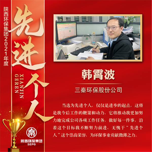 陜西環(huán)保集團2022年工作會議暨二屆一次職代會上表彰了一批敢闖、敢干、敢為人先的先進個人。他們憑借對環(huán)保事業(yè)的執(zhí)著與熱愛,埋頭苦干、厚積薄發(fā),他們懷揣著環(huán)保事業(yè)的遠大夢想,擔當作為、奮斗奉獻,他們用自己的行動詮釋初心使命、國企擔當。現(xiàn)推出“樹立先進 激勵前行”專欄,感悟榜樣精神、凝聚榜樣力量,讓榜樣的光芒化為強大的動力,助力集團高質(zhì)量發(fā)展再上新臺階。